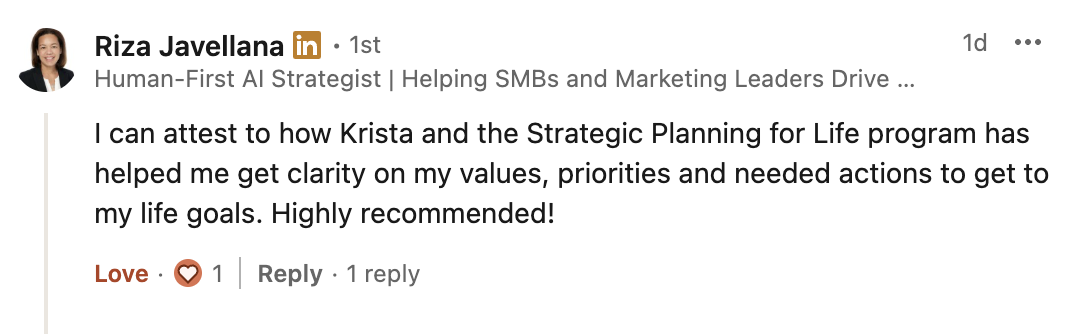 Over the last decade, weâve shared the Strategic Planning for Life framework with THOUSANDS of people. I highlight the number because that feels unreal to say. And my heart explodes at the same moment with joy and gratitude. Integrating even a tiny piece of Strategic Planning for Life has been known to change lives.