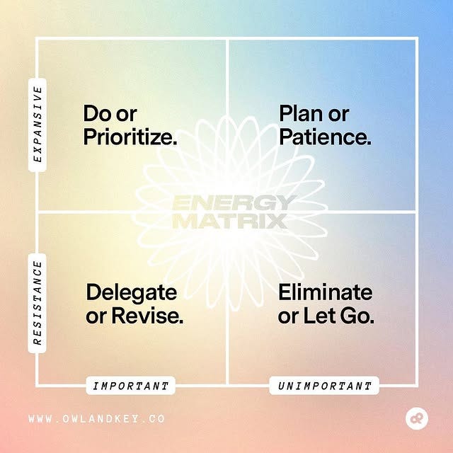 To help clarify priorities, we use a tool called the Energy Matrix. It’s a simple framework for distinguishing between what needs attention and what can be let go.
